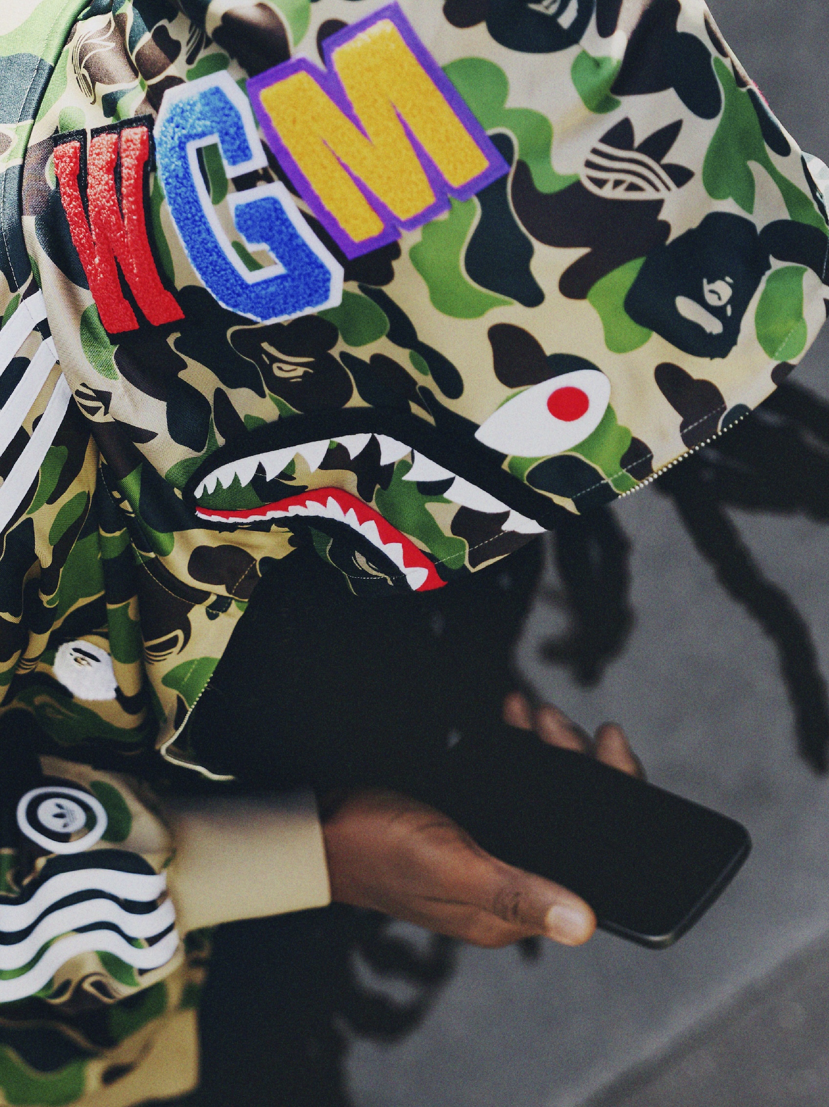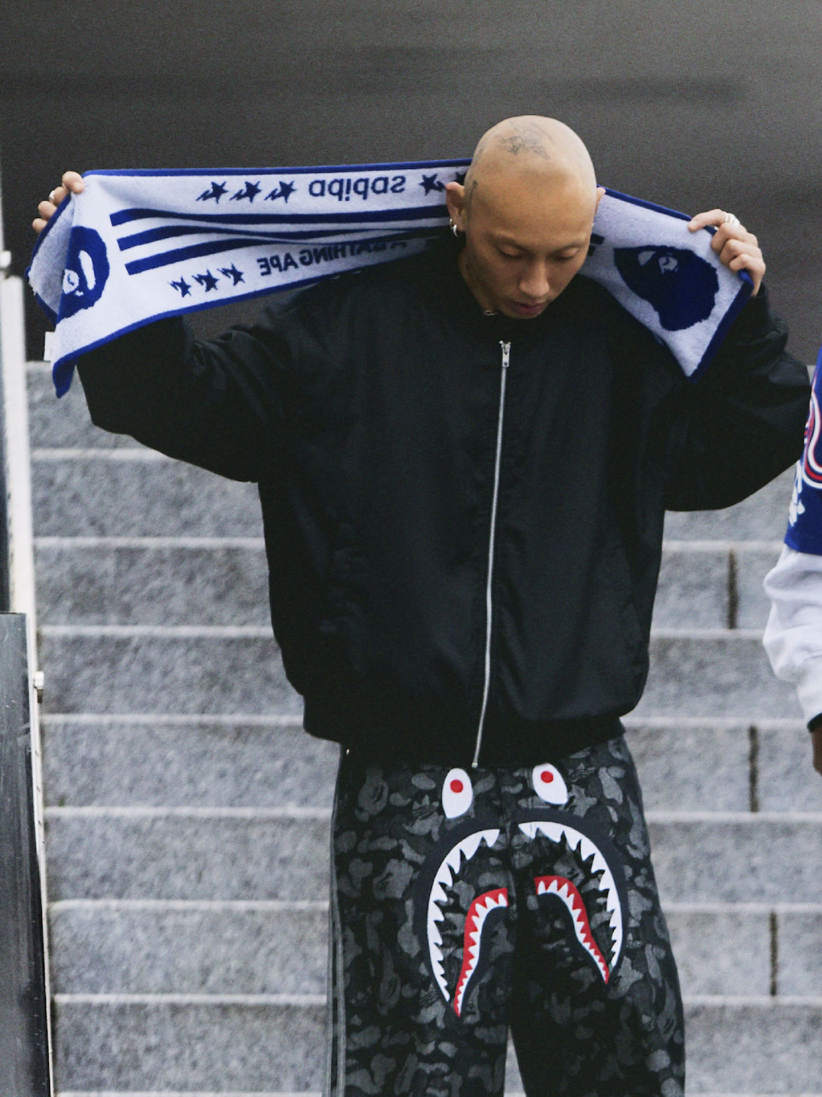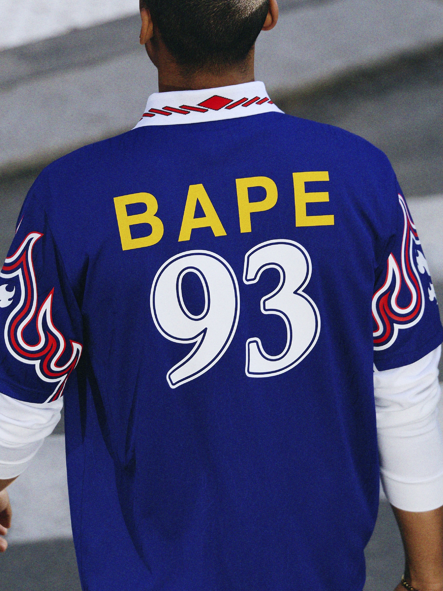 Designed for football fans and streetwear enthusiasts alike, the collection draws from iconic moments in the sport and reimagines them through BAPE®’s unmistakable design language. Central to the range is a newly co-created camo print, paired with striking graphics and co-branded detailing.