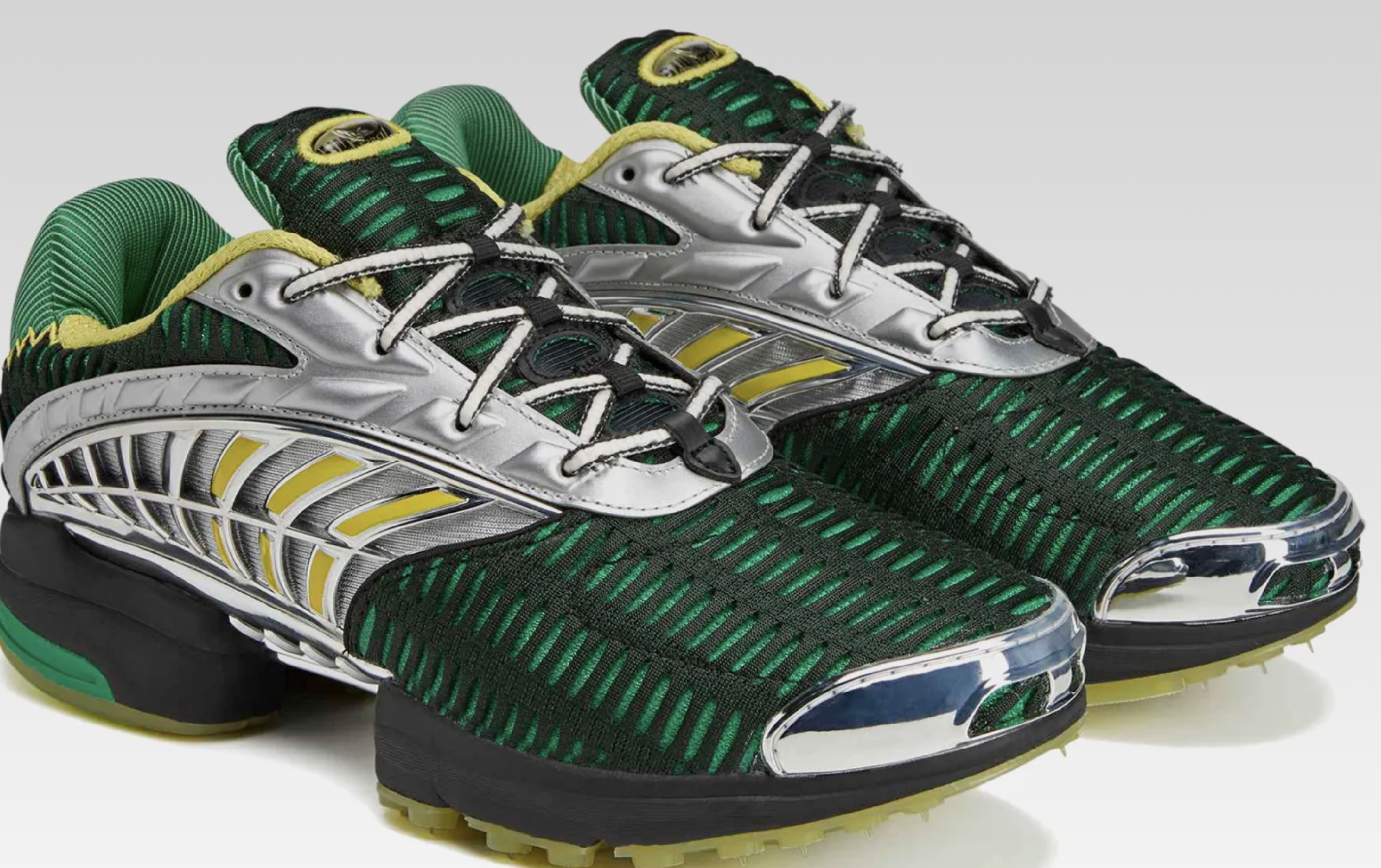 This iteration of the retro runner is dressed in a rich green knitted mesh upper, delivering a breathable, lightweight foundation that stays true to adidas’ performance DNA. Metallic silver synthetic overlays cut sharply across the shoe, adding contrast and structure while nodding to early-2000s running aesthetics. At the heel, subtle pinstriping introduces an unexpected tailoring reference, reinforcing Brain Dead’s talent for blending disparate design worlds.