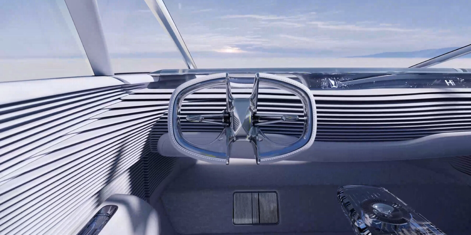 Between the front seats, the central Vortex also enables transitions between assisted and fully autonomous driving, using intuitive touch and gesture controls. A panoramic transparent display spans the dashboard, while a reflective steering wheel completes the futuristic cockpit.