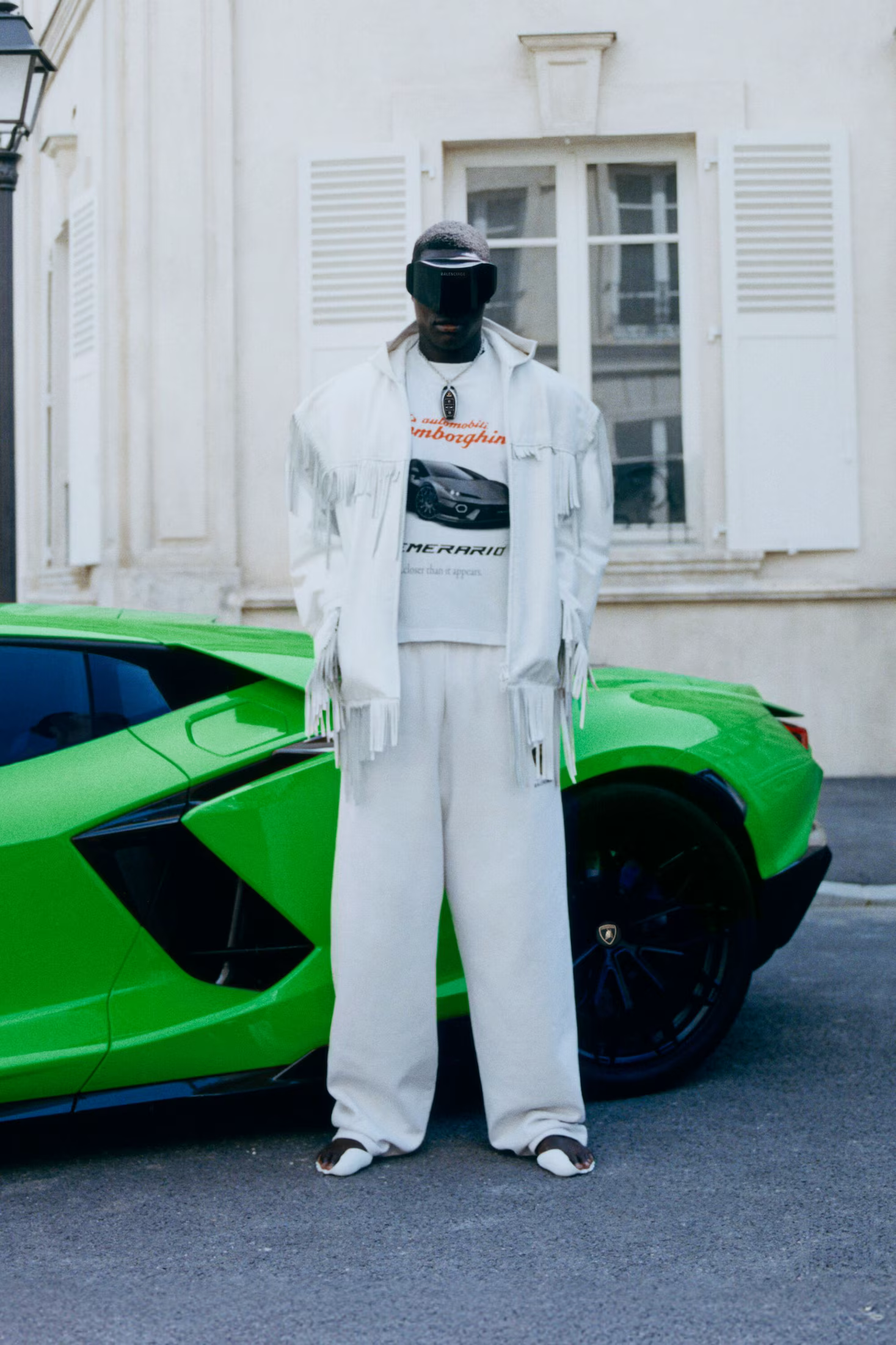Founded in 1963 by Ferruccio Lamborghini, the brand has become synonymous with power, precision, and futuristic aesthetics. Balenciaga translates these values into a collection that spans ready-to-wear, leather goods, jewelry, and accessories. Expect oversized bombers, leather racing jackets, graphic hoodies, trompe-l’œil layered shirts featuring the 2025 Lamborghini Temerario, and co-branded T-shirts.