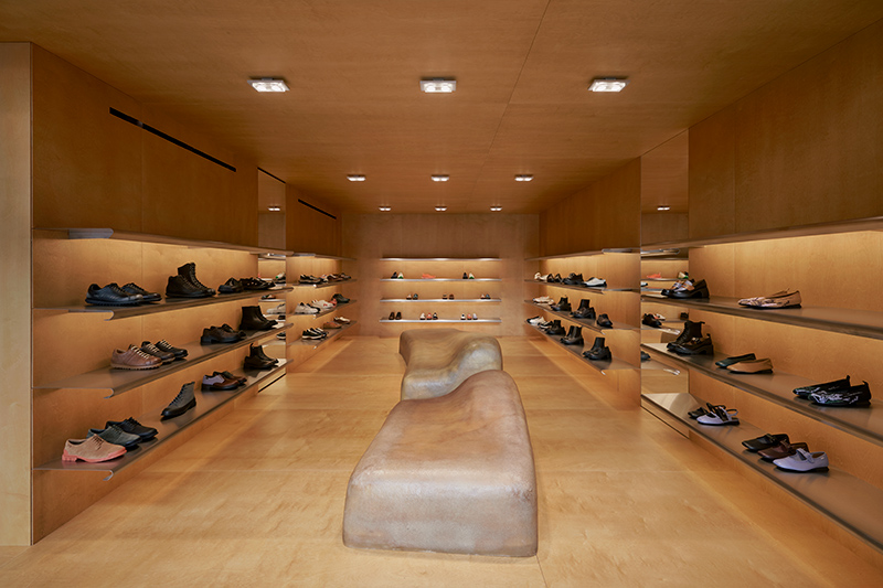 From the outside, a large window frames the interior like a stage, drawing visitors into the Camper universe. Once inside, the atmosphere shifts to one of calm and warmth. The ground floor is entirely clad in birch wood—covering walls, floor, and ceiling in a continuous surface that absorbs and softens natural light. Within this serene setting, shoes are displayed on minimalist stainless-steel frames, their simplicity allowing the footwear to take center stage. A sculptural fiberglass piece anchors the space, serving both as seating and as part of the display, merging functionality with artistic expression.