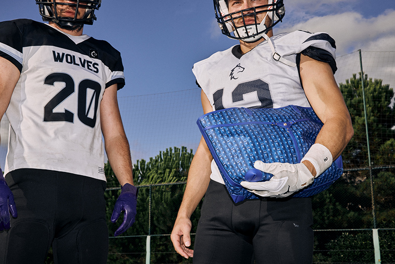 Traditionally, the tote has been seen as feminine—valued for its practicality and understated elegance. MANC repositions it within a world of grit and motion, placing vibrant monogram totes alongside helmets, pads, and turf. In the hands of athletes, the bag takes on a new narrative. It challenges the notion that handbags belong to one gender, proposing instead a vision of style that transcends old boundaries.