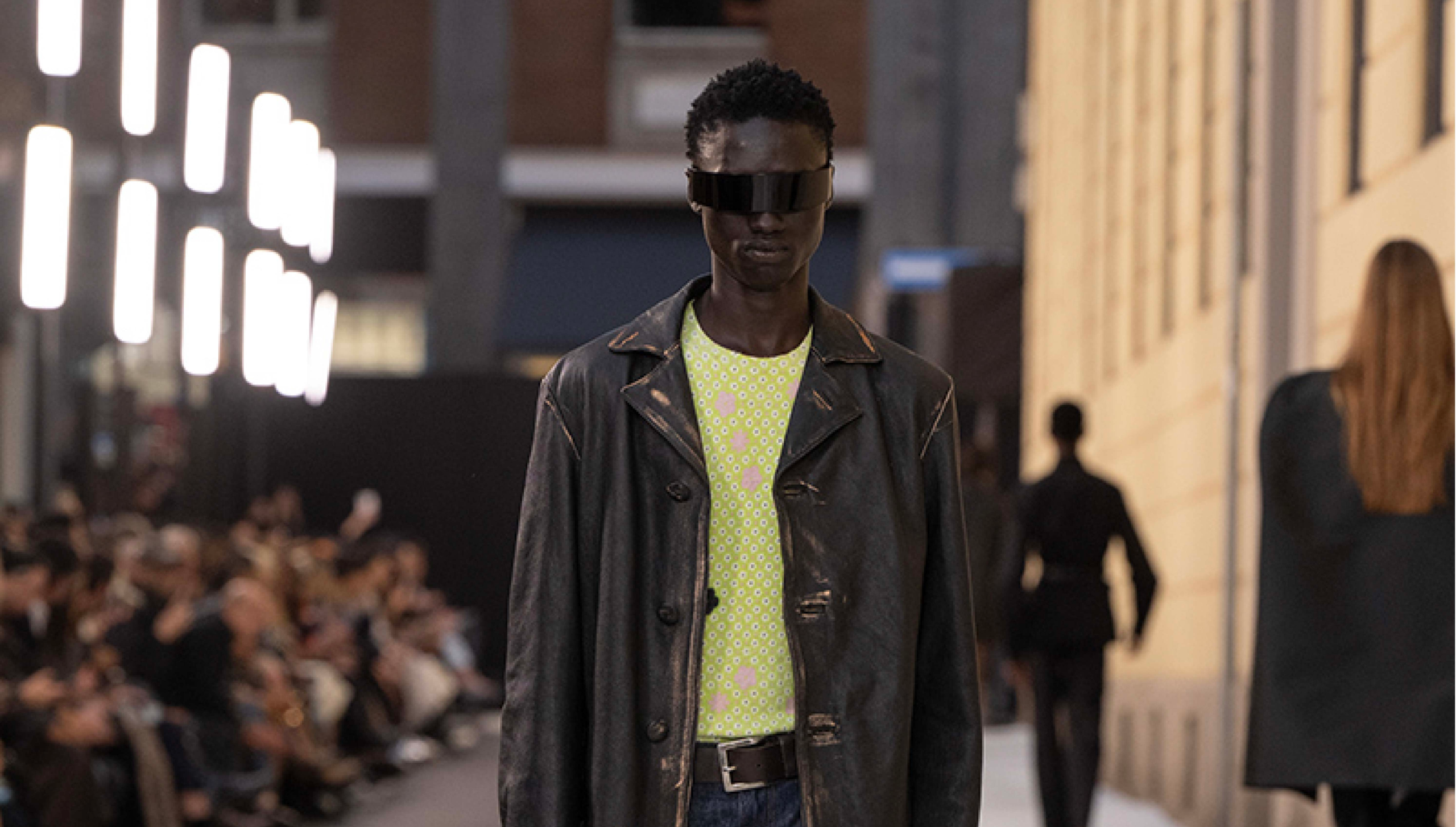Classic garments are deliberately unsettled. The trench is reduced to essential lines. Denim adopts the rigour of tailoring, while tailored trousers take on the ease of denim. Boundaries blur: construction details are left exposed, hems remain raw, and end-of-roll labels are repurposed as design elements, underscoring the house’s fascination with process as much as product.