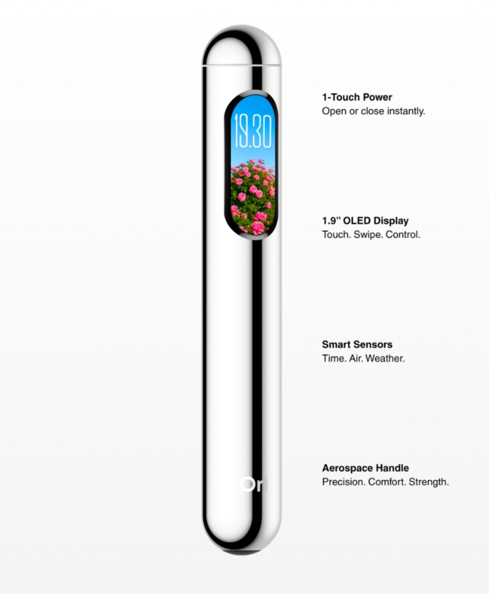 Beyond its mechanical innovation, Ori introduces a digital layer directly into the canopy. Integrated features include AirSense air-quality readings, MoodShift visual themes that respond to weather or user mood, Display Aura customizable color palettes, and Smart Touch one-tap open and close functionality. Together, these elements turn the umbrella into an interactive surface rather than a passive tool.