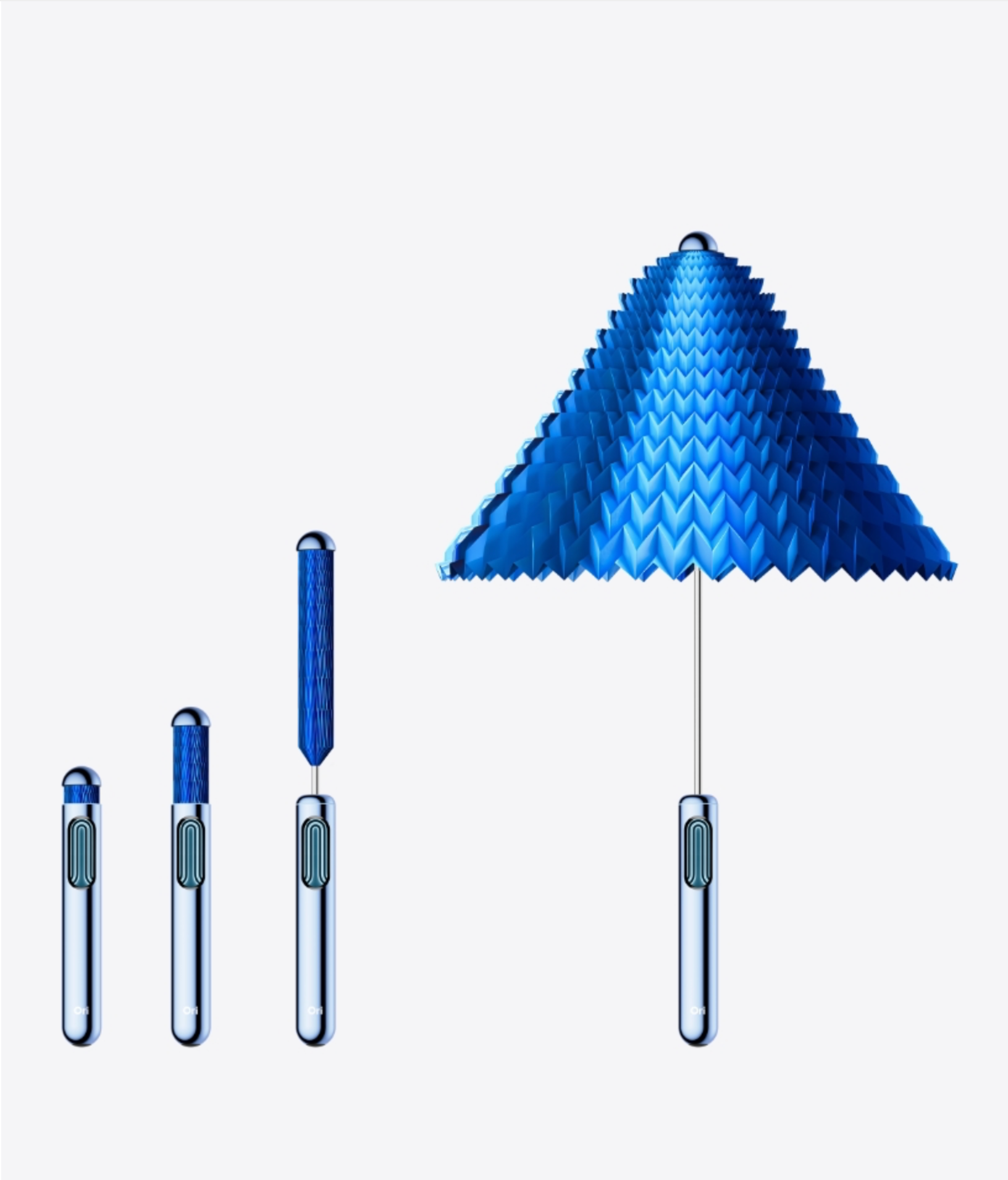 At the core of the design is a patented Miura-based folding architecture. This system allows the canopy to become rigid and self-supporting through a single degree-of-freedom motion, opening with one simple actuation. Precise crease patterns, advanced materials, and an internal locking mechanism give the umbrella its strength and stability, while maintaining an ultra-minimal exterior. Four patents covering the folding system, internal core, and locking components underscore the depth of engineering behind the design.