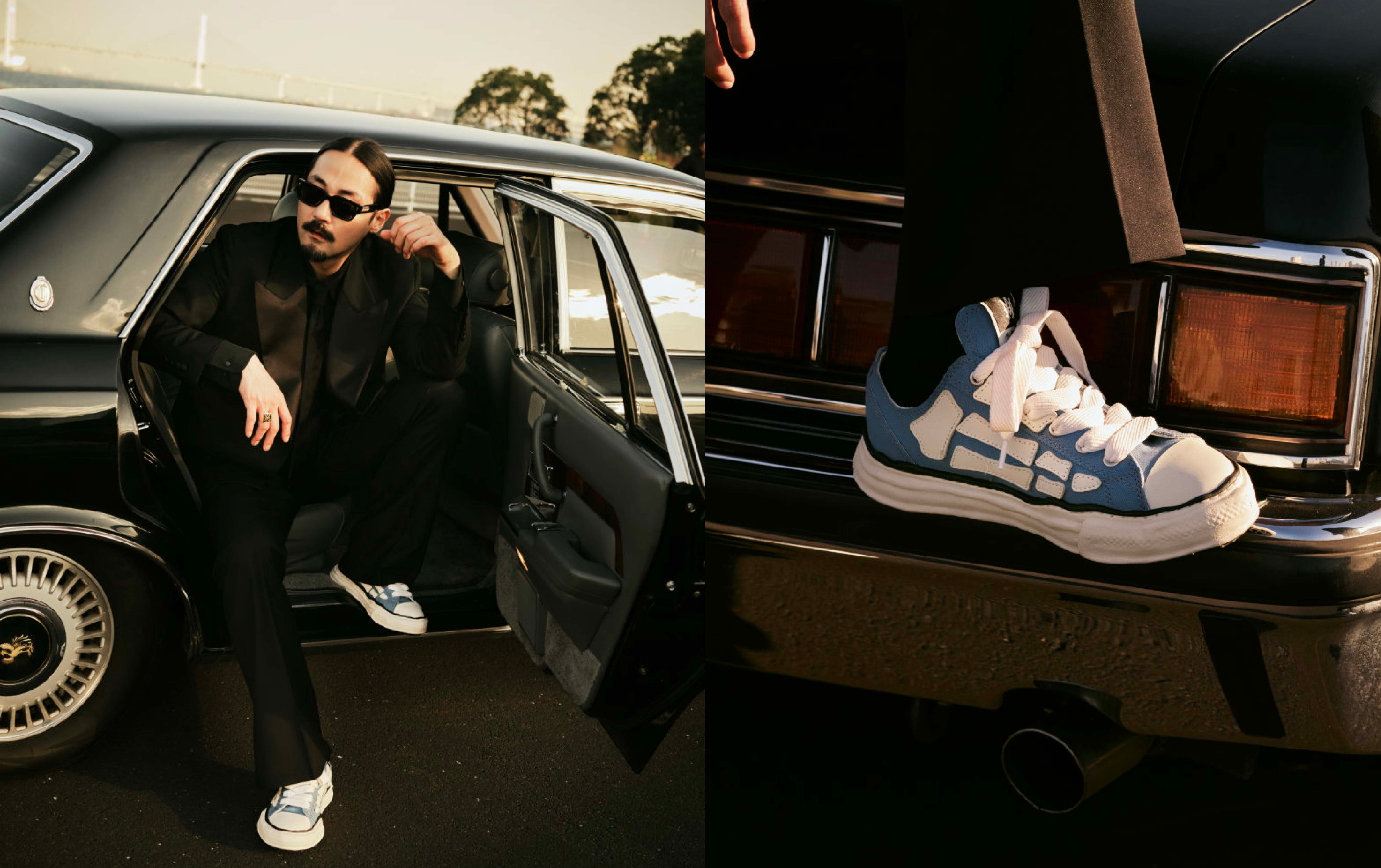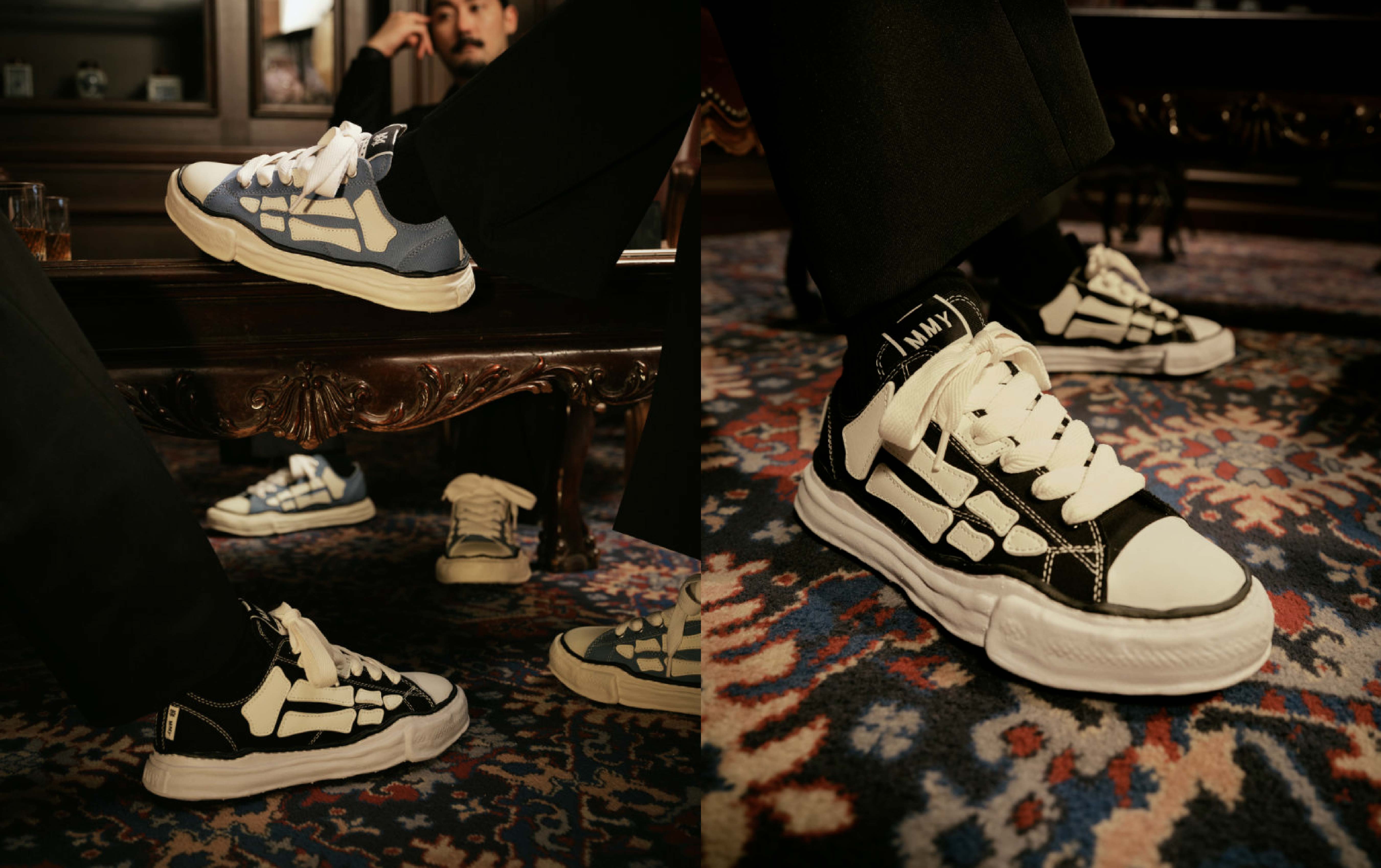 The design merges signature elements from both brands. It features a hybrid sole combining Amiri’s Skel Top-Low foundation with Mihara Yasuhiro’s Peterson OG silhouette. A canvas upper is accented by Amiri’s iconic Nappa leather “Bones” appliqué, while Mihara Yasuhiro’s distinctive clay-molded sole grounds the shoe with a handcrafted finish. Dual-branded woven labels appear on the tongue and heel.